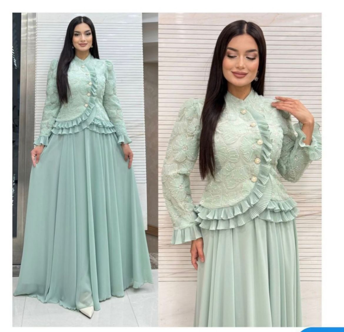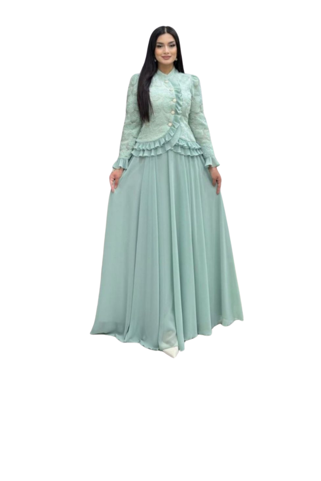 Fii aparitia care inspira eleganta si feminitate cu acest set rafinat in nuanta verde menta, compus dintr-un top din dantela cu volane fine si o fusta lunga, fluida. Designul romantic este completat de nasturi decorativi si o textura usor vaporoasa, perfecta pentru evenimente de zi, petreceri sofisticate sau ceremonii speciale.