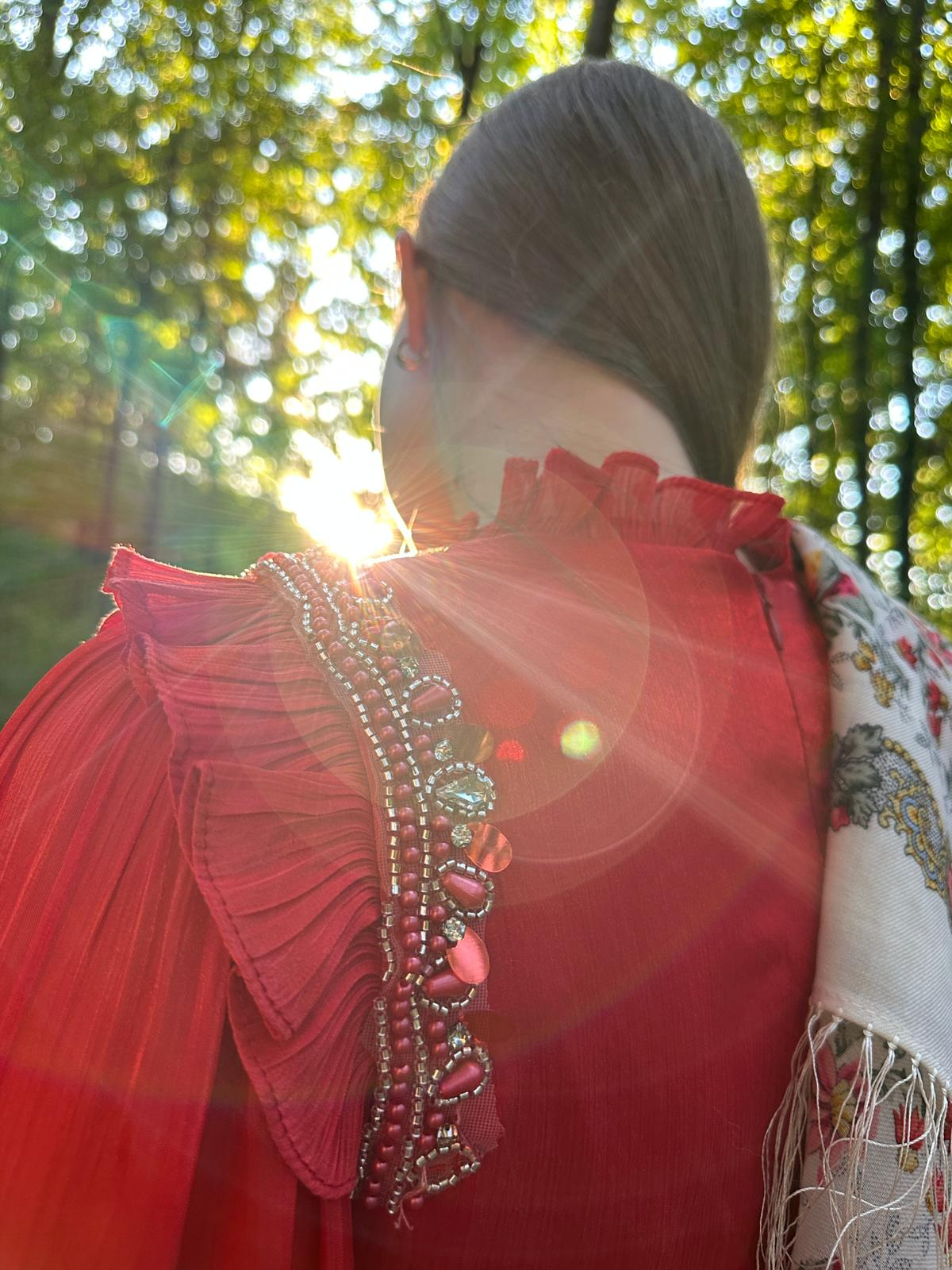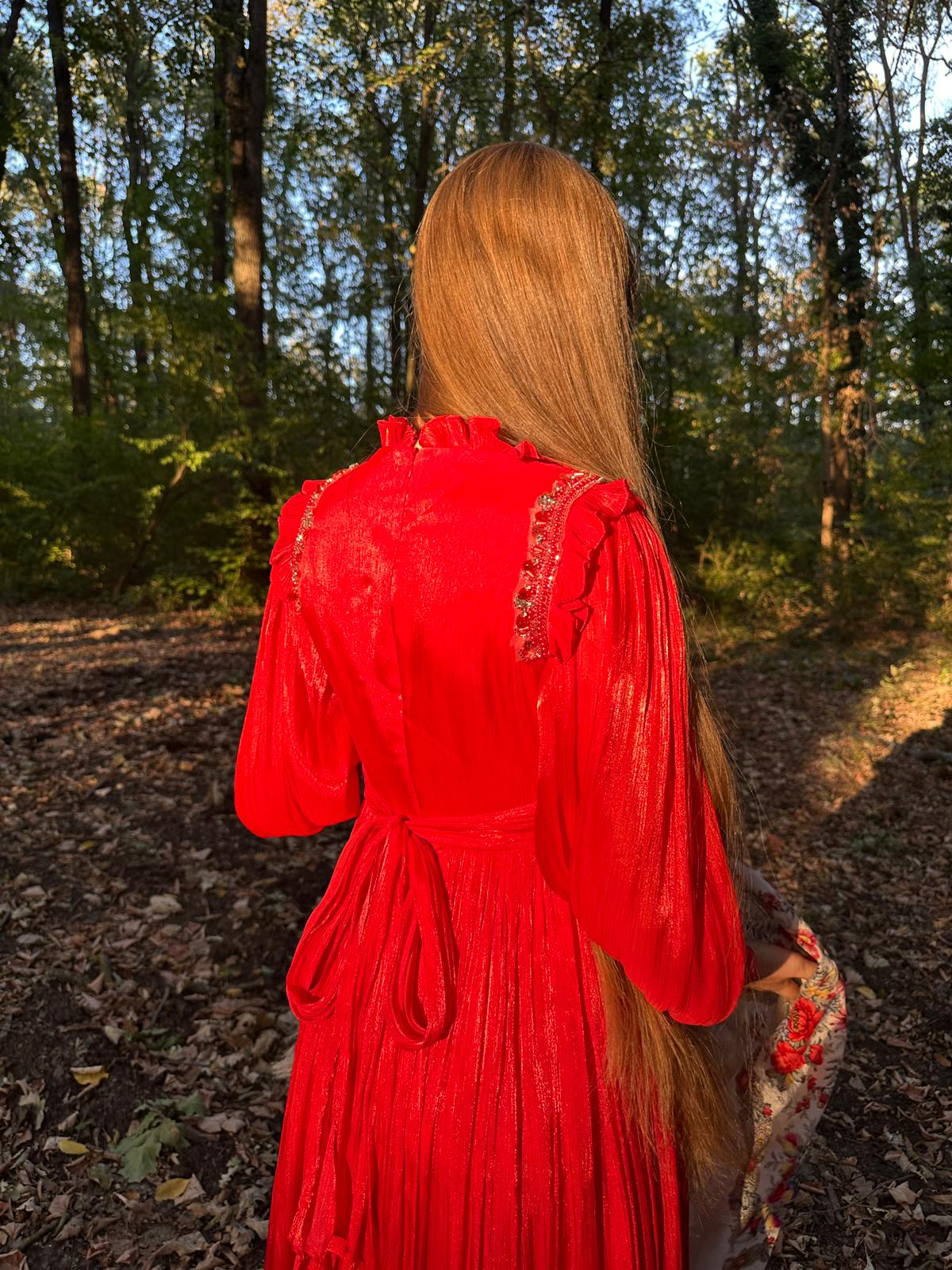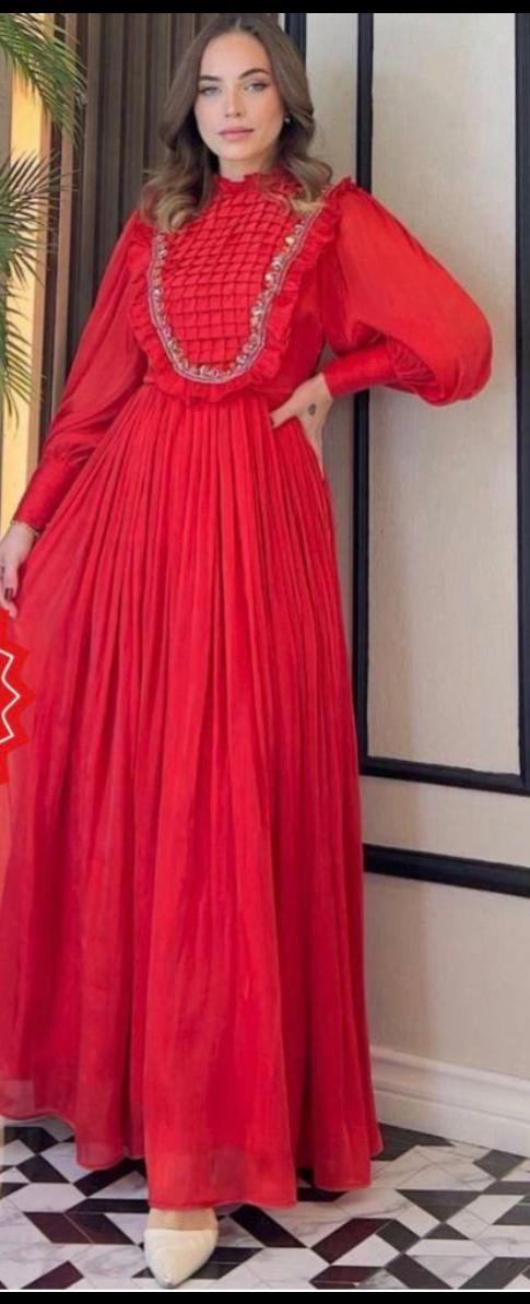 Rochie maxi în nuanță roșu intens, cu fustă amplă plissată și linie elegantă care alungește silueta. Partea superioară este evidențiată de un pieptar decorativ (aplicație cu mărgele/paiete) încadrat de volănaș delicat, iar gulerul înalt adaugă un aer rafinat, perfect pentru evenimente. Mânecile lungi și croiala lejeră oferă confort, iar ținuta capătă un efect spectaculos în mișcare, ideal pentru ocazii speciale, cununii, botezuri sau seri festive.