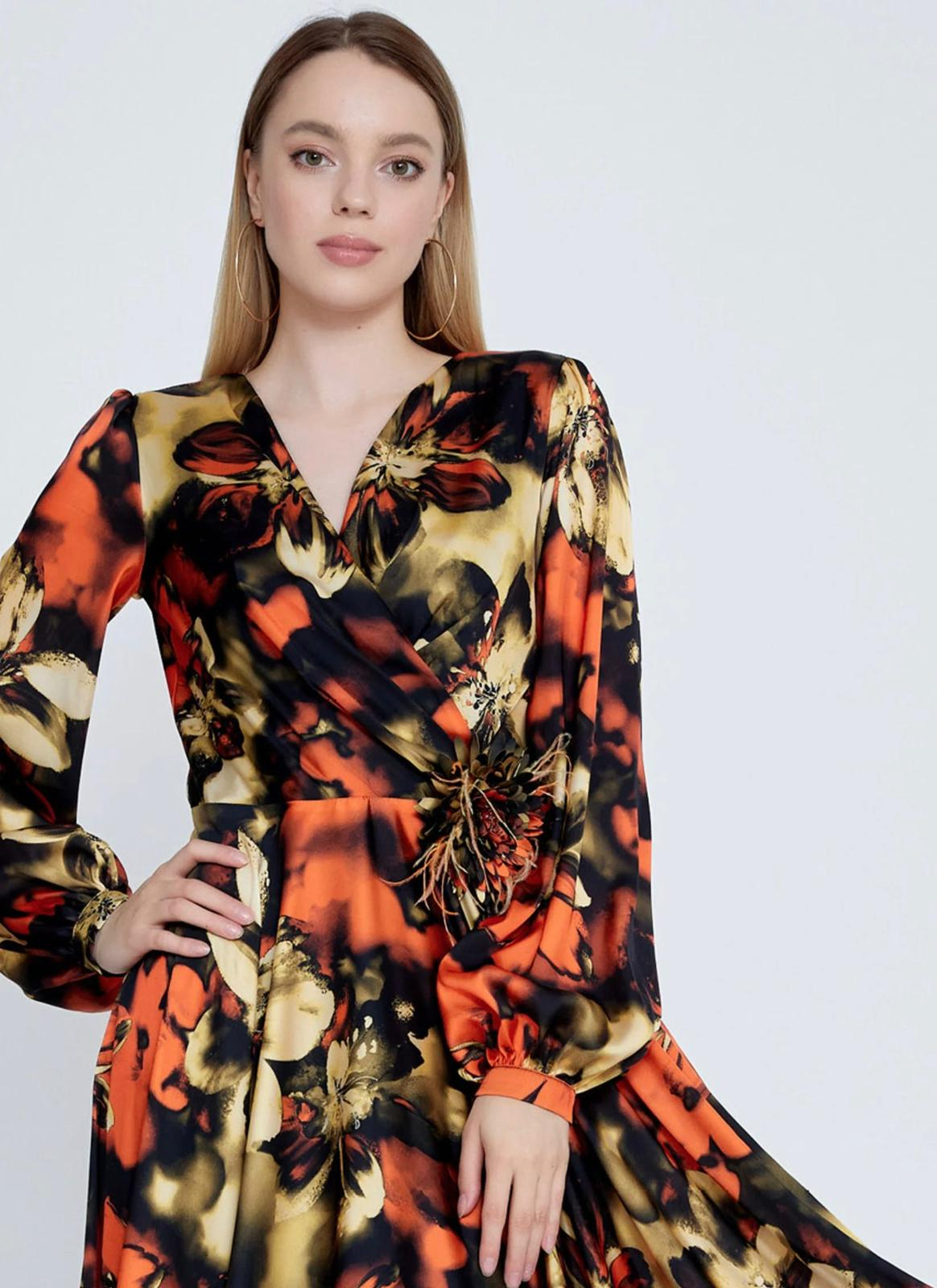 Cand vrei o rochie care sa arate elegant din prima, modelul acesta maxi cu imprimeu floral statement este alegerea perfecta. Contrastul dintre fundalul negru si florile in tonuri calde de caramiziu si bej creeaza un efect sofisticat, potrivit atat pentru evenimente de seara, cat si pentru ocazii speciale de zi.